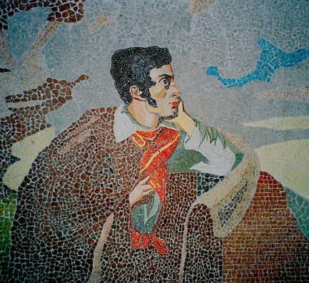 "Adam Mickiewicz" 2006 r. według obrazu Walentego Wańkowicza "Mickiewicz na Judachu skale" Mozaika znajduje się w szkole im. Adama Mickiewicza w Lubiniu koło Kościana.